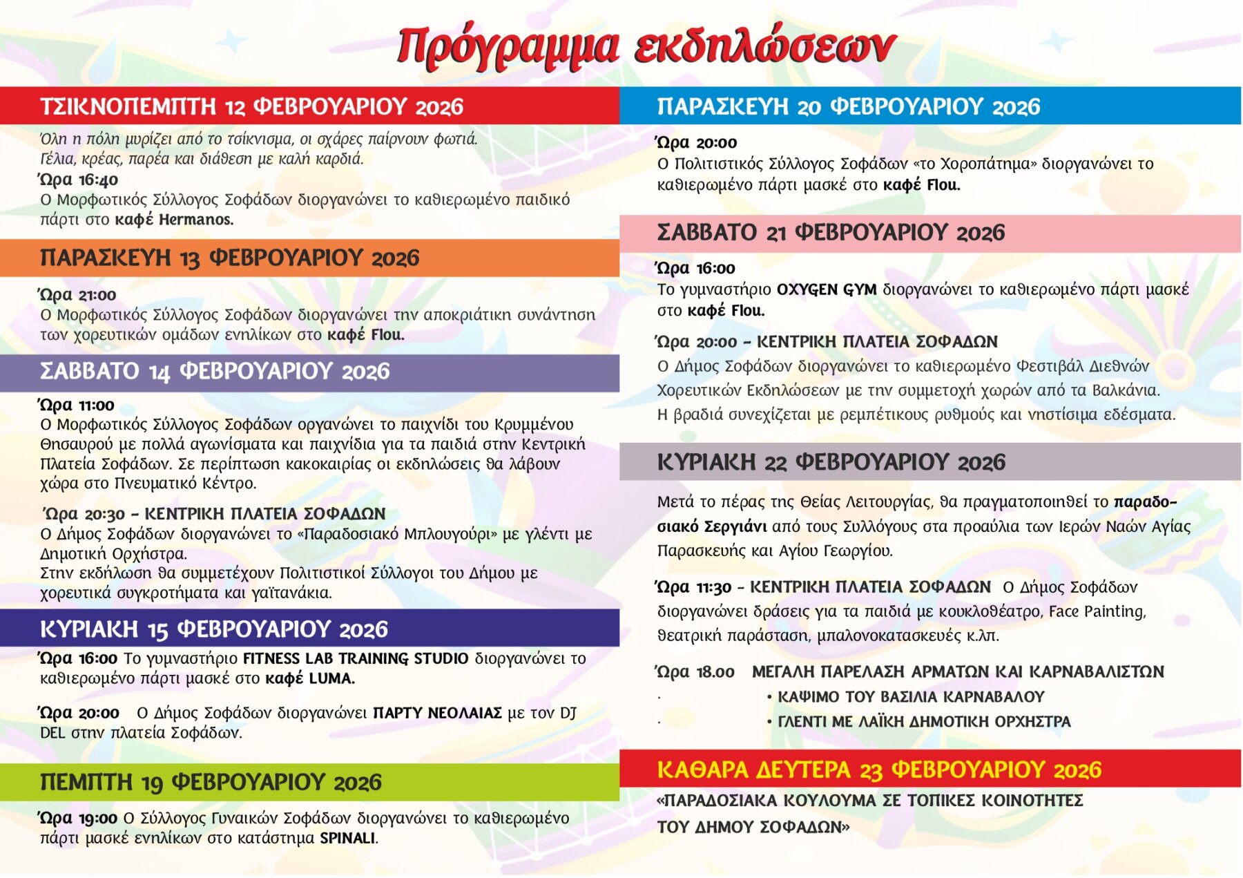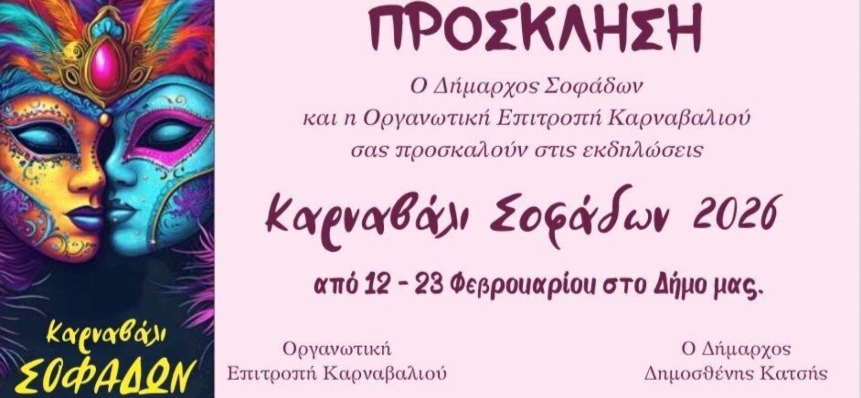 Οι Σοφάδες ετοιμάζονται να φορέσουν τα γιορτινά τους για το 44ο Καρναβάλι, έναν θεσμό που, όπως τονίζει η Αλεξία Θεογιάννη που έχει αναλάβει το συντονισμό της Οργανωτικής Επιτροπής, σε συνεργασία με τον Δήμαρχο Δημοσθένη Κατσή, «πρόκειται για έναν θεσμό, φαντασμαγορικό, ο οποίος αριθμεί 43 χρόνια». Έναν θεσμό που μεγαλώνει, εξελίσσεται και παραμένει ζωντανός μέσα από τη συμμετοχή της τοπικής κοινωνίας.