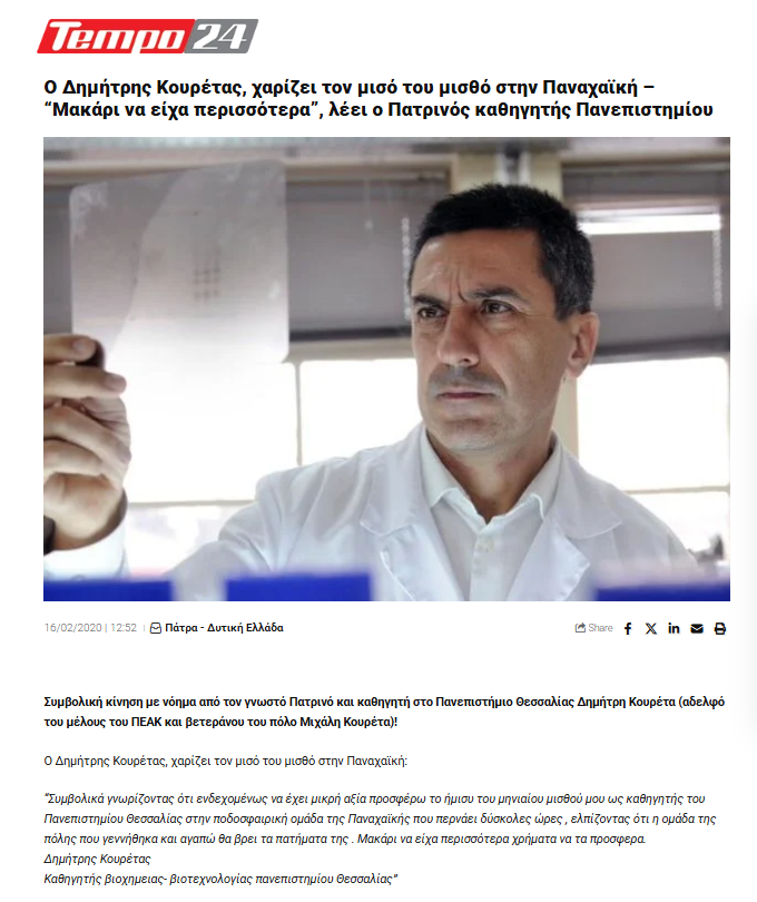 Όταν ως καθηγητής δίνεις για τη «καψούρα» σου τη Παναχαϊκή το μισό μισθό σου, για τους Πατρινούς αυτό είναι σίγουρα αξιέπαινο.