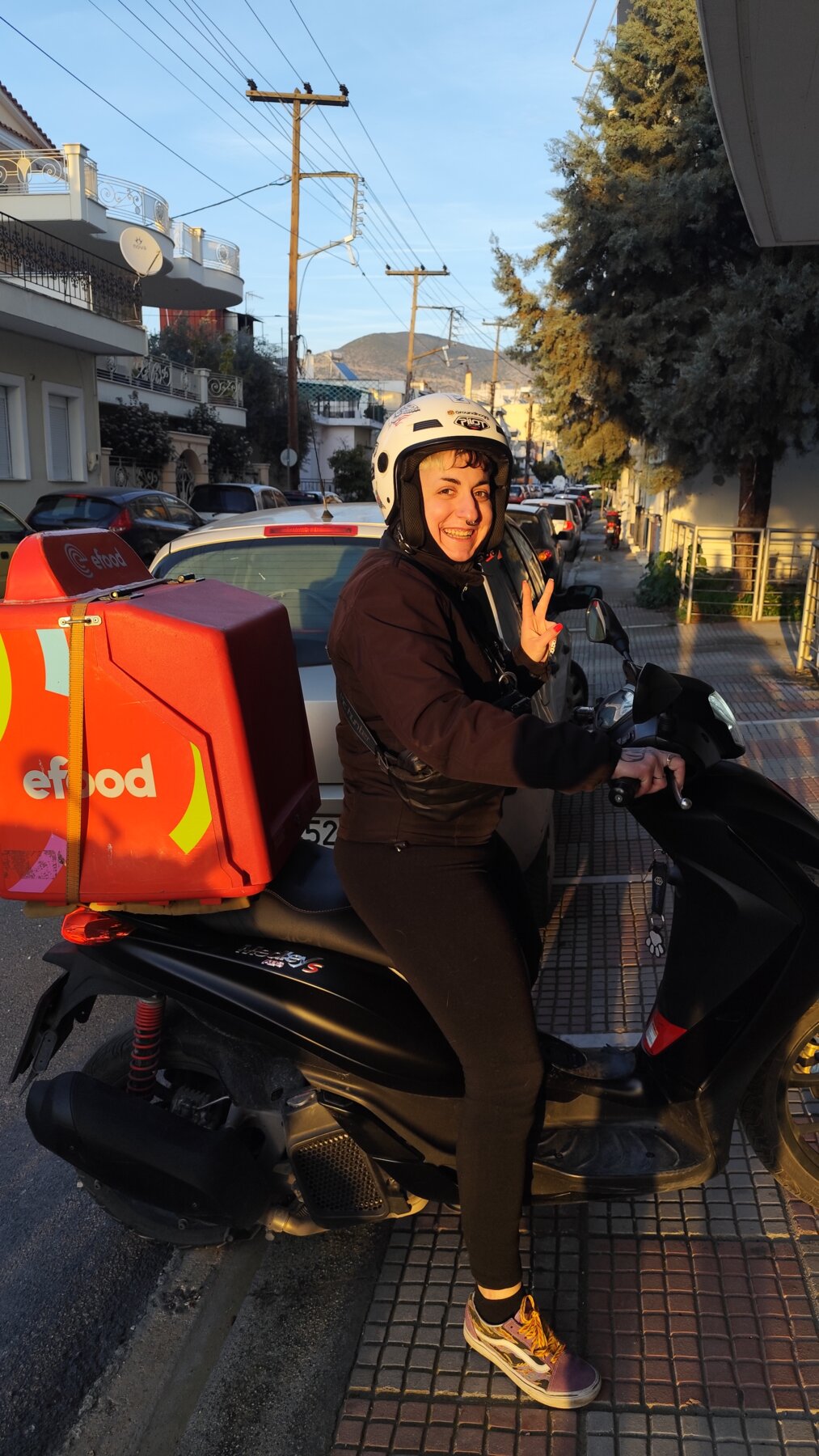 Είμαι από τις πρώτες εργαζόμενες στην πλατφόρμα που εργάζομαι (Efood). Δεν είχα πρότερη εμπειρία στον κλάδο της διανομής και ο κύριος λόγος που επέλεξα αυτή τη δουλειά είναι ότι εκείνη την περίοδο μου δόθηκε η ευκαιρία να εργαστώ με ποδήλατο καθώς δεν διέθετα ακόμη μοτοσυκλέτα και δίπλωμα οδήγησης. Στην πορεία, έμαθα να οδηγώ μοτοσυκλέτα και ξεκίνησα να εργάζομαι με εκείνη.