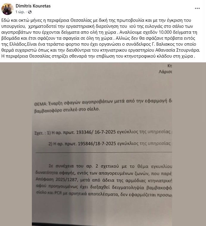 Είναι χαρακτηριστικό ότι ο ίδιος αναφέρει στην ανάρτηση πως «η Περιφέρεια Θεσσαλίας χρηματοδοτεί την εργαστηριακή διερεύνηση του ιού της ευλογιάς στο σάλιο των αιγοπροβάτων που έρχονται δείγματα από ολόκληρη τη χώρα». Το σημείο όμως που προκαλεί έντονο προβληματισμό είναι ότι πρόκειται για χρήματα του Θεσσαλού φορολογούμενου, που κατευθύνονται σε μια διαδικασία για την οποία η πολιτεία και ο ΕΟΦ δεν έχουν δώσει έγκριση.
