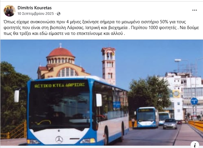 Η ιστορία έχει ως εξής: Σύμφωνα με την ανακοίνωση του Αστικού ΚΤΕΛ Λάρισας, από τις 11 Σεπτεμβρίου 2025 τέθηκε σε ισχύ πιλοτικό πρόγραμμα που μειώνει τη μηνιαία κάρτα απεριορίστων διαδρομών από 30 σε 15 ευρώ και την ετήσια από 200 σε 100 ευρώ, με δυνατότητα μετακίνησης στις ζώνες Α’ και Β’. Το μέτρο αφορά αποκλειστικά ενεργούς φοιτητές σχολών που στεγάζονται στο συγκρότημα Βιόπολις, κατόπιν σύμβασης που υπεγράφη μεταξύ του Περιφερειάρχη και του προέδρου του ΚΤΕΛ, Μιχάλη Σακελλαρίου.