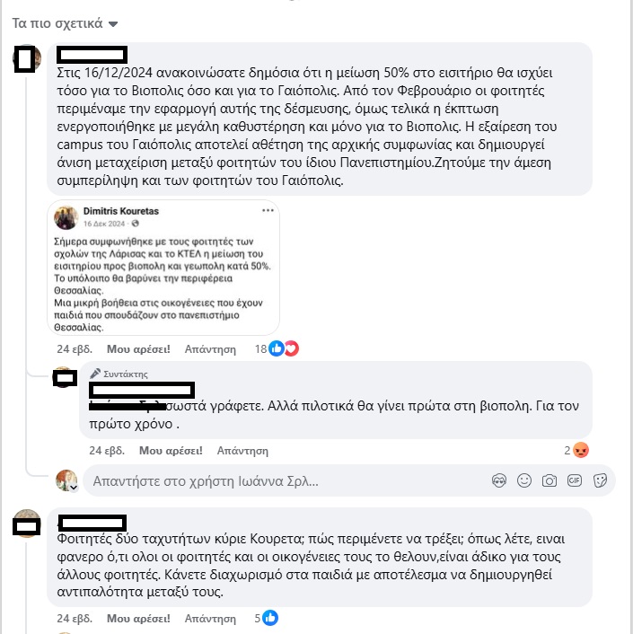 Ανακοίνωνε δηλαδή ότι το μέτρο θα εφαρμοζόταν και στα δύο συγκροτήματα, κάτι το οποίο φυσικά δεν συνέβη, γεγονός το οποίο όμως δεν πέρασε απαρατήρητο από τους ακολούθους του στο διαδίκτυο, με έναν εξ αυτών, φοιτητή, να του επισημαίνει: «Στις 16/12/2024 ανακοινώσατε δημόσια ότι η μείωση 50% στο εισιτήριο θα ισχύει τόσο για το Βιοπολις όσο και για το Γαιόπολις. Από τον Φεβρουάριο οι φοιτητές περιμέναμε την εφαρμογή αυτής της δέσμευσης, όμως τελικά η έκπτωση ενεργοποιήθηκε με μεγάλη καθυστέρηση και μόνο για το Βιοπολις. Η εξαίρεση του campus του Γαιόπολις αποτελεί αθέτηση της αρχικής συμφωνίας και δημιουργεί άνιση μεταχείριση μεταξύ φοιτητών του ίδιου Πανεπιστημίου.Ζητούμε την άμεση συμπερίληψη και των φοιτητών του Γαιόπολις».