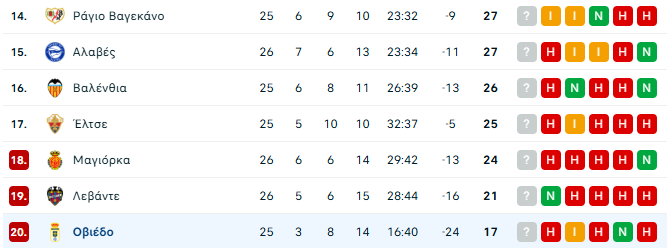 Έτσι, η Ατλέτικο ανέβηκε στην τρίτη θέση της βαθμολογίας με 51 βαθμούς, όσους έχει και η Βιγιαρεάλ την οποία προσπέρασε στην ισοβαθμία, ενώ η ομάδα του Νταβίντ Κάρμο είναι ουραγός στη βαθμολογία με 17 βαθμούς.