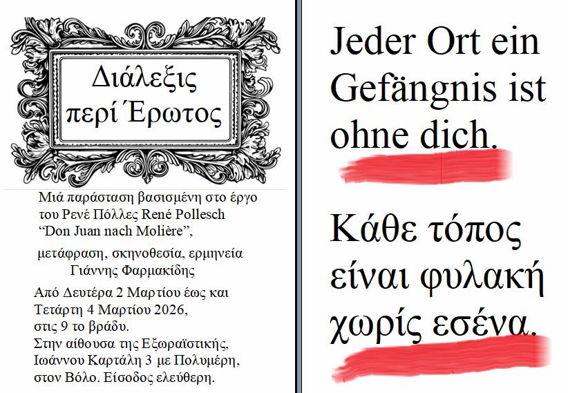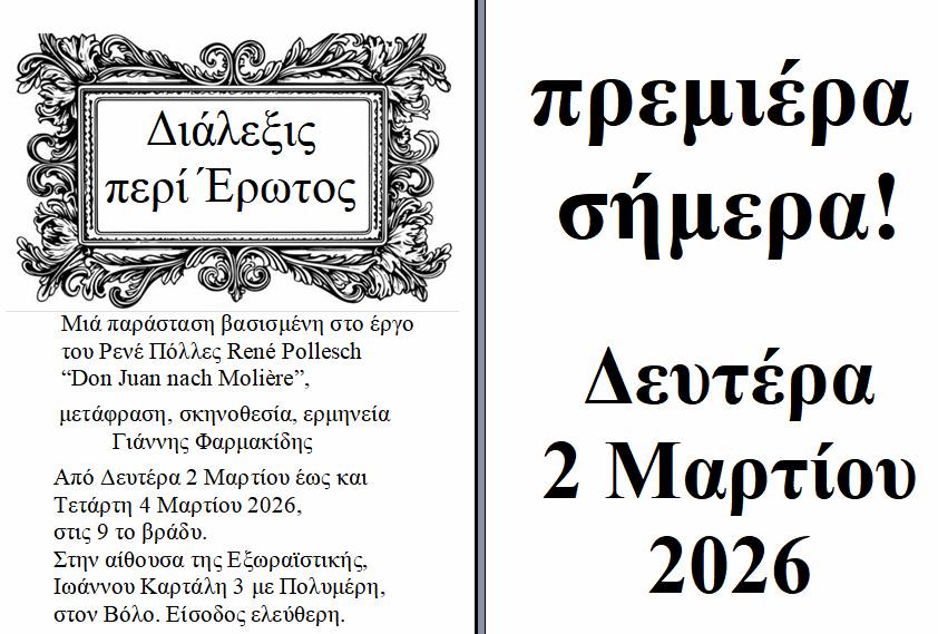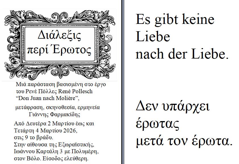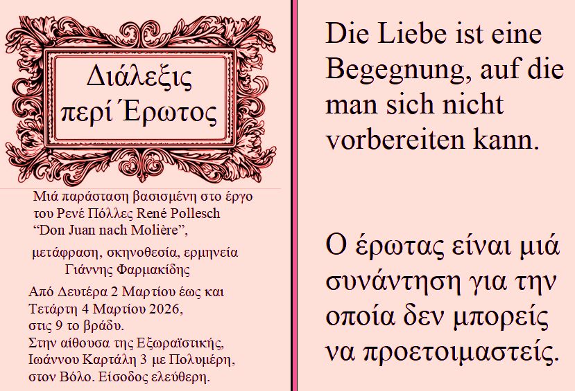 Μια διαφορετική θεατρική εμπειρία υπόσχεται ο ηθοποιός και σκηνοθέτης Γιάννης Φαρμακίδης με τη νέα του παράσταση «Διάλεξις περί Έρωτος», η οποία παρουσιάζεται για πρώτη φορά στην Ελλάδα, στον Βόλο, στην αίθουσα της Εξωραϊστικής, με ελεύθερη είσοδο για το κοινό.