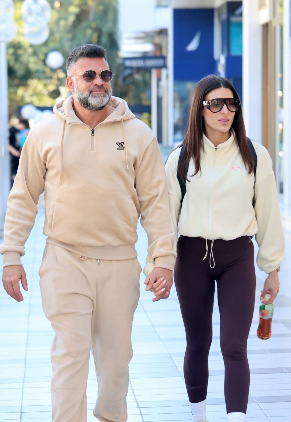 Ο Κώστας Σόμμερ επέλεξε μπεζ hoodie και φόρμα, συνδυασμένα με αθλητικά παπούτσια και γυαλιά ηλίου, ενώ η Βαλεντίνη φορούσε λευκό zip hoodie, σκούρο κολάν, λευκά sneakers και oversized γυαλιά ηλίου.