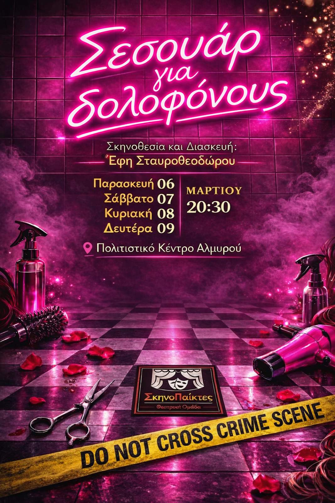 Η υπόθεση εκτυλίσσεται σε ένα φαινομενικά αθώο κομμωτήριο, όπου καθημερινές φιγούρες μετατρέπονται σε υπόπτους, τα μυστικά αποκαλύπτονται και το γέλιο μπλέκεται με την αγωνία. Με καυστικό χιούμορ και κινηματογραφικό ρυθμό, η παράσταση προσκαλεί το κοινό να συμμετάσχει ενεργά στην εξέλιξη της ιστορίας.