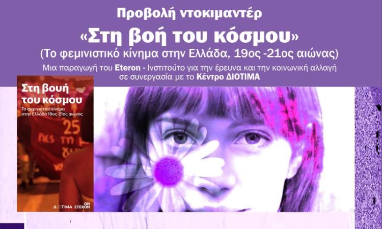 Στο ίδιο πλαίσιο δράσεων εντάσσεται και η προβολή του ντοκιμαντέρ «Στη βουή του κόσμου», που θα πραγματοποιηθεί την Τετάρτη 11 Μαρτίου στις 19:00 στο καφενείο Πασπαρτού (28ης Οκτωβρίου 231 με Βλαχάβα, στον Βόλο). Το ντοκιμαντέρ αποτελεί συμπαραγωγή του Eteron – Ινστιτούτου για την Έρευνα και την Κοινωνική Αλλαγή και του Κέντρου Διοτίμα και εστιάζει στην ιστορία του φεμινιστικού κινήματος στην Ελλάδα.