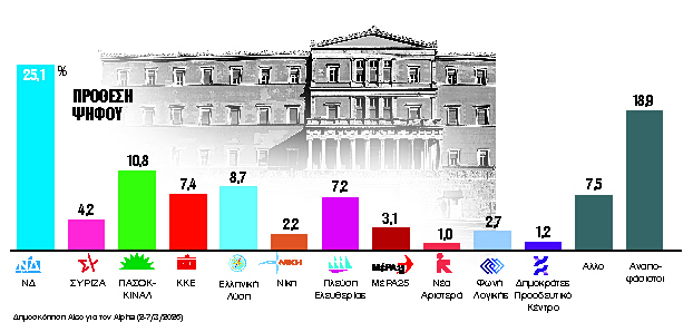 Ως προς τους «μεγάλους» δείκτες, επιβεβαιώνεται ενίσχυση της ΝΔ καθαρά πάνω από το 25% στην πρόθεση ψήφου που είναι, βάσει του εκλογικού νόμου, το ουσιαστικό κατώφλι για να ξεκλειδώσει το κλιμακωτό μπόνους εδρών. Ενισχυμένη ωστόσο παραμένει η δεξαμενή των αναποφάσιστων, καθώς σχεδόν δύο στους δέκα παραμένουν εκεί. Η ΝΔ κινείται στην πρόθεση ψήφου στο 25,1% από 23,5% τον περασμένο Ιανουάριο και το ΠΑΣΟΚ στο 10,8% (Alco/Alpha), ενώ ανάμεσα στα κόμματα που χάνουν δυνάμεις είναι από τα δεξιά η Ελληνική Λύση και από τα αριστερά η Πλεύση Ελευθερίας. Αλλο γκάλοπ (Opinion Poll/Action24) δείχνει τη ΝΔ στο 26,6% στην πρόθεση ψήφου (στο 32,7% στην εκτίμηση) και το ΠΑΣΟΚ στο 10,7% στην πρόθεση (13,2% στην εκτίμηση) με τα υπόλοιπα κόμματα σε μονοψήφια ποσοστά.
