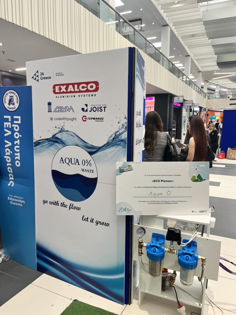 Το βραβείο της οικολογικής πρωτοπορίας “ECO Pioneer 2026” απέσπασε η καινοτόμος επιχειρηματική πρόταση “Aqua 0, Zero Waste” του Προτύπου Γενικού Λυκείου Λάρισας στον διαγωνισμό για την ανάδειξη των καλυτέρων μαθητικών «εικονικών επιχειρήσεων» από το Oργανισμό εκπαίδευσης και επιχειρηματικότητας “Junior Achievement Greece” (J.A. Greece). Η επιχειρηματική πρόταση παρουσιάσθηκε στην Εμπορική Μαθητική Έκθεση της Θεσσαλονίκης την περασμένη Παρασκευή, στην οποία συμμετείχαν σαράντα οκτώ (48) μαθητικές εικονικές επιχειρήσεις από Βόρεια Ελλάδα και Θεσσαλία και πραγματοποιήθηκε στις εγκαταστάσεις του «Mediterranean Cosmos». Mέγας χορηγός και σ΄ αυτή την προσπάθεια του σχολείου η γνωστή Λαρισινή βιομηχανία Αλουμινίου «Exalco A.E.».
