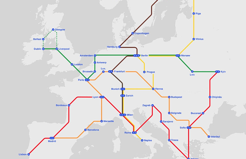 Σε αυτό το πλαίσιο, παρουσιάζεται το φιλόδοξο σχέδιο Starline, που προτείνει τη δημιουργία ενός «μεγα-μετρό ευρωπαϊκής κλίμακας». Πρόκειται για ένα δίκτυο πέντε γραμμών υψηλής ταχύτητας, συνολικού μήκους 22.000 χιλιομέτρων, το οποίο θα συνδέει σχεδόν 40 πόλεις σε όλη την ήπειρο. Από τη Μαδρίτη έως το Βερολίνο, μέσω Παρισιού και Ρώμης, αλλά και με γραμμές που θα φτάνουν έως το Κίεβο και την Κωνσταντινούπολη, το σχέδιο φιλοδοξεί να αλλάξει ριζικά τον τρόπο που ταξιδεύουν οι Ευρωπαίοι.