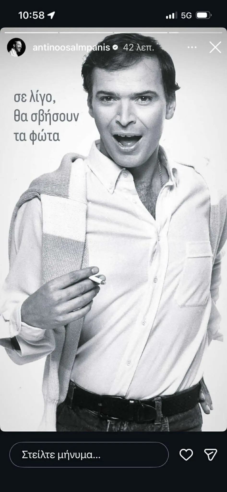 Ο ηθοποιός Αντίνοος Αλμπάνης ανάρτησε μία ασπρόμαυρη φωτογραφία του ηθοποιού, συνοδεύοντας την με τα εξής λόγια: «Σε λίγο, θα σβήσουν τα φώτα».