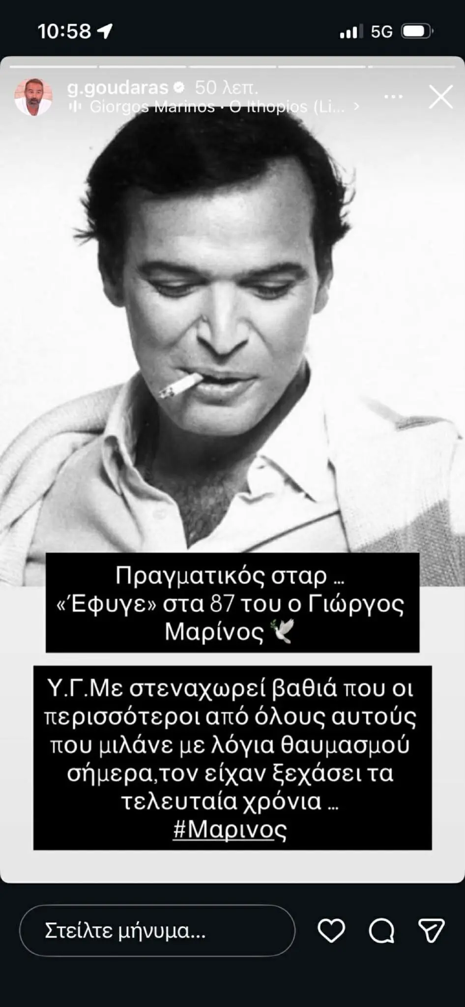 Ο Γρηγόρης Γκουντάρας είπε το τελευταίο του αντίο, αφήνοντας αιχμηρά σχόλια για τα κροκοδείλια δάκρυα πολλών που στην ουσία τον είχαν αποβάλλει από την μνήμη τους τα τελευταία του χρόνια. «Πραγματικός σταρ.. Έφυγε στα 87 του ο Γιώργος Μαρίνος. Με στεναχωρεί βαθιά που οι περισσότεροι από όλους αυτούς που μιλάνε με λόγια θαυμασμού σήμερα, τον είχαν ξεχάσει τα τελευταία χρόνια».
