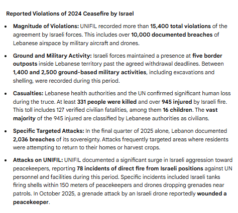 Παρά τη συμφωνία, η UNIFIL έχει καταγράψει περισσότερες από 10.000 ισραηλινές παραβιάσεις από την έναρξη ισχύος της, συμπεριλαμβανομένων σχεδόν καθημερινών επιθέσεων που σκότωσαν και τραυμάτισαν εκατοντάδες ανθρώπους, μεταξύ των οποίων γυναίκες και παιδιά.