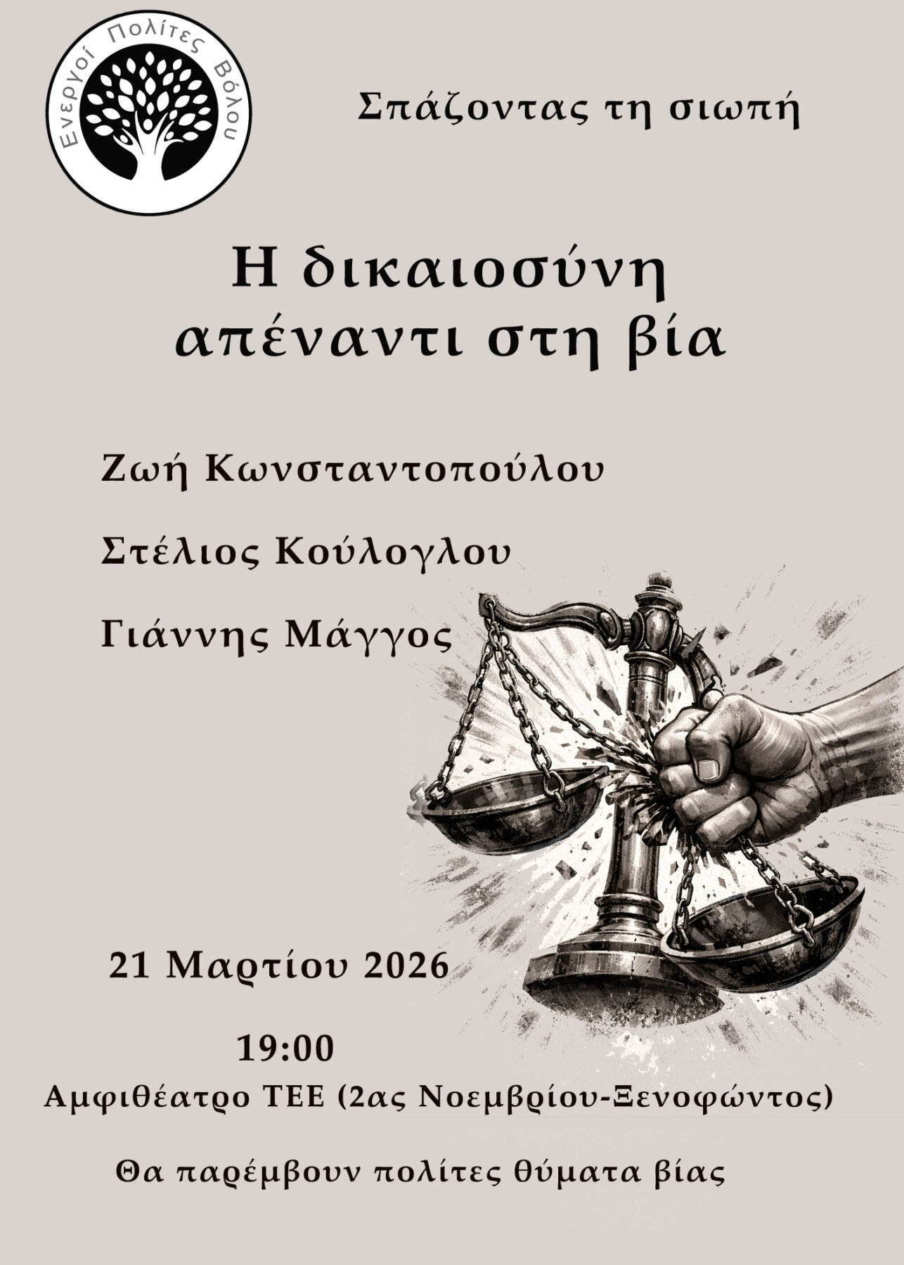 Οι Ενεργοί Πολίτες Βόλου προσκαλούν όλους στην εκδήλωση που διοργανώνουν το Σάββατο 21 Μαρτίου, στις 19:00 στο αμφιθέατρο του ΤΕΕ Μαγνησίας (2ας Νοεμβρίου-Ξενοφώντος) με τίτλο: Σπάζοντας τη σιωπή. Η δικαιοσύνη απέναντι στη βία.