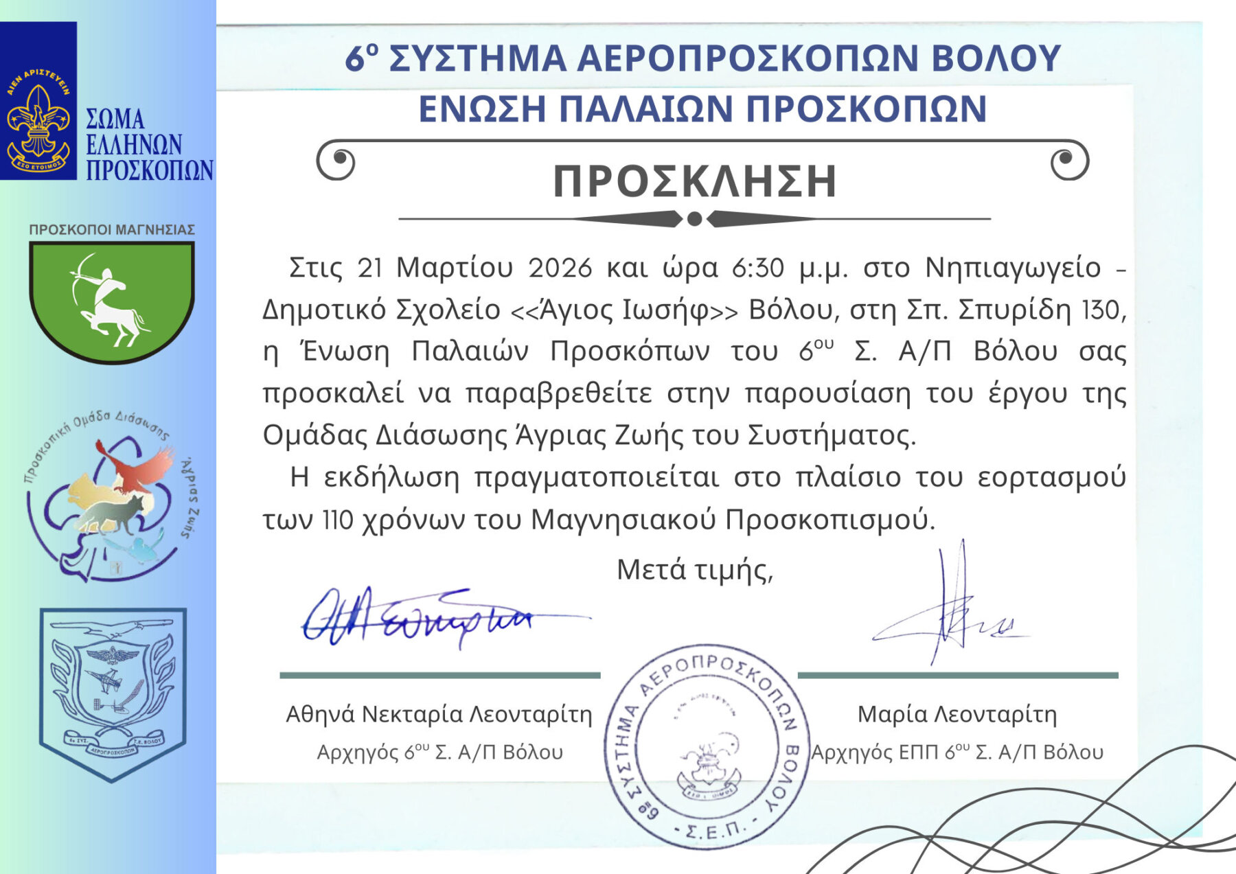 Μια ξεχωριστή εκδήλωση αφιερωμένη στην προσφορά, την ευαισθητοποίηση και την προστασία της άγριας ζωής διοργανώνει το 6ο Σύστημα Αεροπροσκόπων Βόλου και η Ένωση Παλαιών Προσκόπων, το Σάββατο 21 Μαρτίου 2026, στις 18:30, στο Νηπιαγωγείο – Δημοτικό Σχολείο «Άγιος Ιωσήφ» Βόλου, στην οδό Σπ. Σπυρίδη 130. Η εκδήλωση πραγματοποιείται στο πλαίσιο των 110 χρόνων του Μαγνησιακού Προσκοπισμού και εστιάζει στο έργο της ΠΟΔΑΖ, της Προσκοπικής Ομάδας Διάσωσης Άγριας Ζωής.