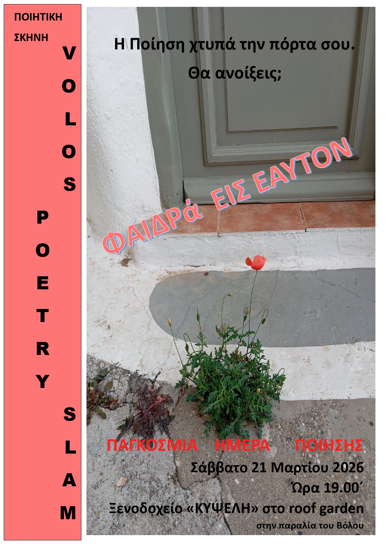 Το Σάββατο 21 Μαρτίου 2026, η Παγκόσμια Ημέρα Ποίησης βρίσκει ξανά τον Βόλο να γιορτάζει με λέξεις, συναίσθημα και ανοιχτή καρδιά. Η ποιητική σκηνή Volos Poetry Slam προσκαλεί το κοινό στις 19:00, στο roof garden του ξενοδοχείου Κυψέλη, σε μια ξεχωριστή βραδιά με τίτλο «Φαιδρά εις Εαυτόν».