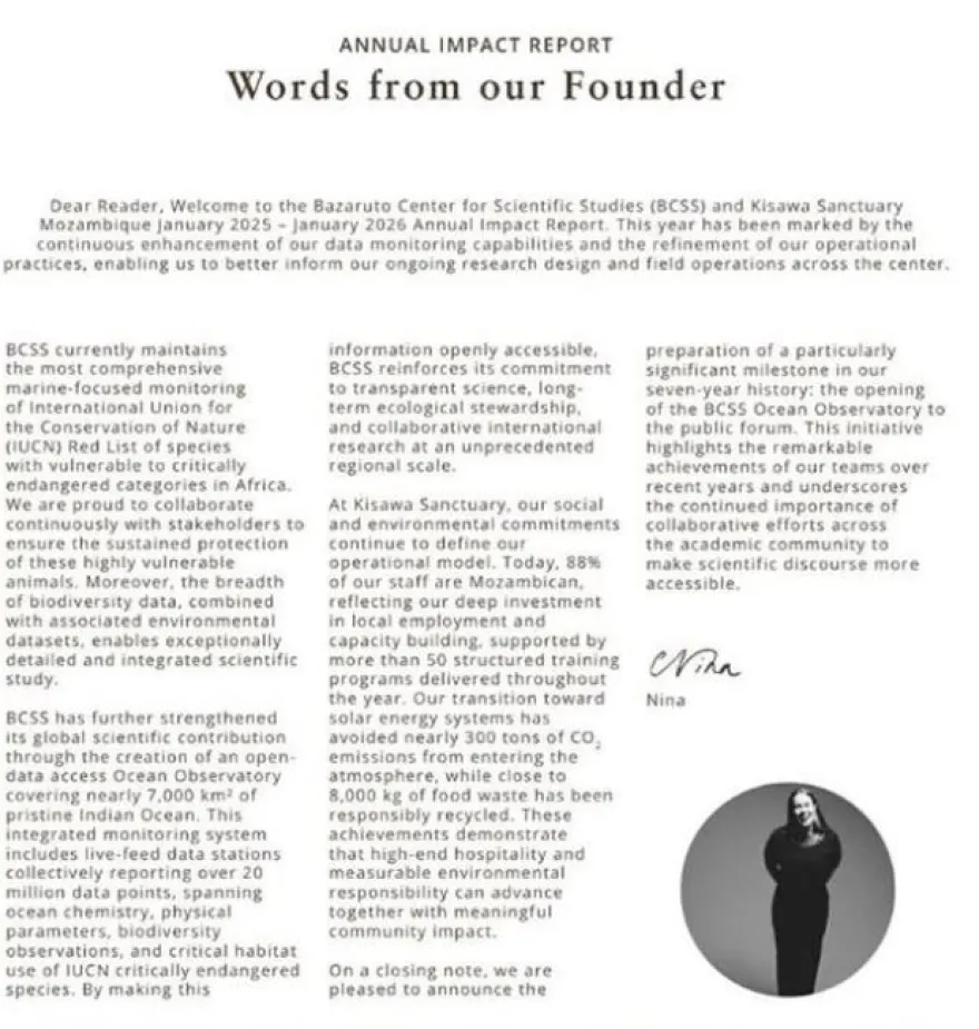 Το θέρετρο Kisawa, περιγράφεται στον επίσημο ιστότοπό του, ως ένα καταφύγιο 300 στρεμμάτων με δασώδεις περιοχές, παραλίες και αμμόλοφους, που βρίσκεται στο νότιο άκρο του νησιού Benguerra. Παράλληλα, η Nina Flohr, έχει ιδρύσει ένα επιστημονικό Κέντρο στην περιοχή, όπου βρίσκεται το θέρετρο, το BCSS, που εστιάζει στα θαλάσσια οικοσυστήματα.