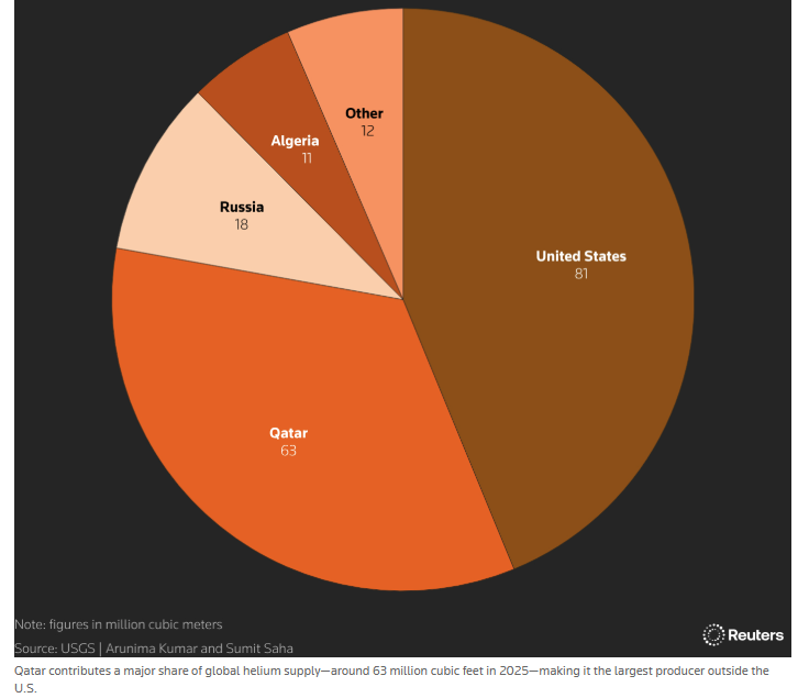 Η παγκόσμια προσφορά ηλίου, το οποίο προκύπτει ως υποπροϊόν από την επεξεργασία φυσικού αερίου, είναι ιδιαίτερα συγκεντρωμένη γεωγραφικά. Το Κατάρ παράγει σχεδόν το ένα τρίτο των παγκόσμιων ποσοτήτων, σύμφωνα με στοιχεία της Γεωλογικής Υπηρεσίας των ΗΠΑ, γεγονός που εντείνει την ευαλωτότητα της αγοράς.