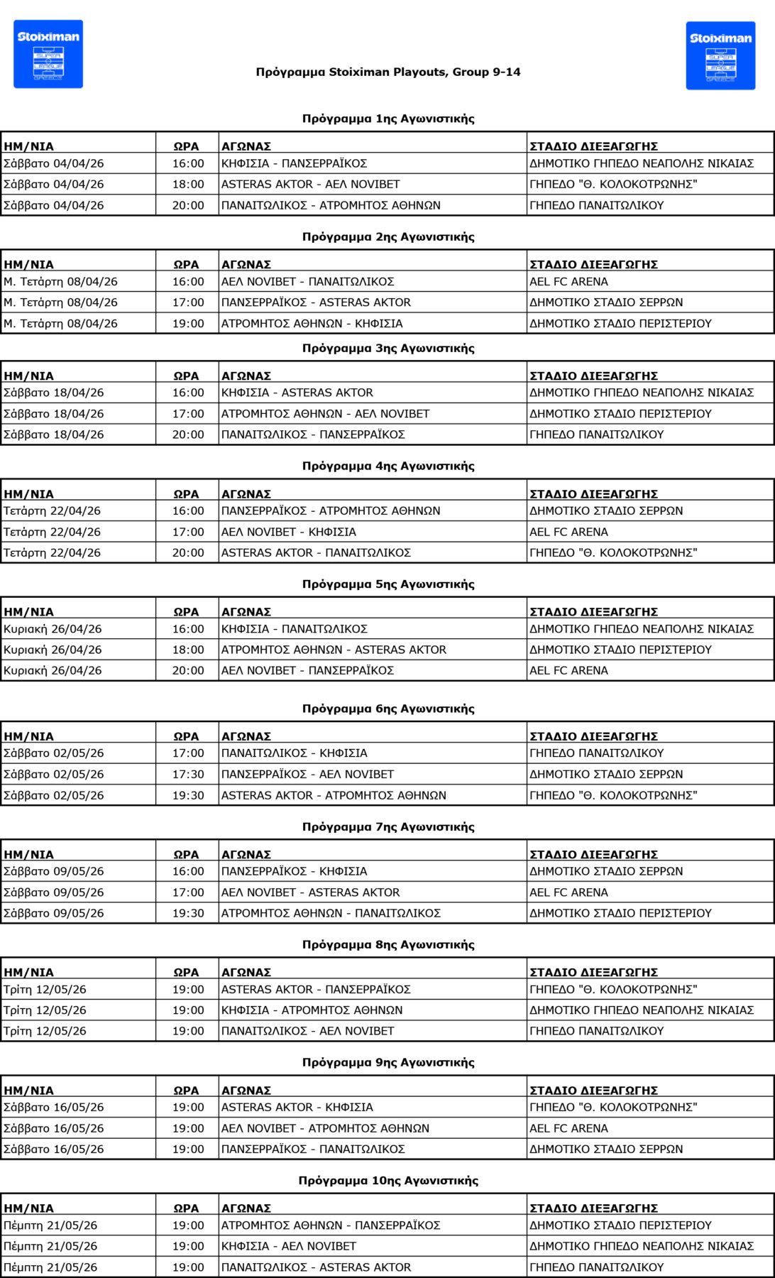 H Stoiximan Super League έκανε γνωστό το πρόγραμμα των play outs με ημέρες και ώρες. Η ΑΕΛ Νovibet στην πρεμιέρα θα αντιμετωπίσει το προσεχές Σάββατο(18:00) στην Τρίπολη τον Αστέρα, ενώ την δεύτερη αγωνιστική θα υποδεχτεί την Μεγάλη Τετάρτη(16:00)τον Παναιτωλικό.
