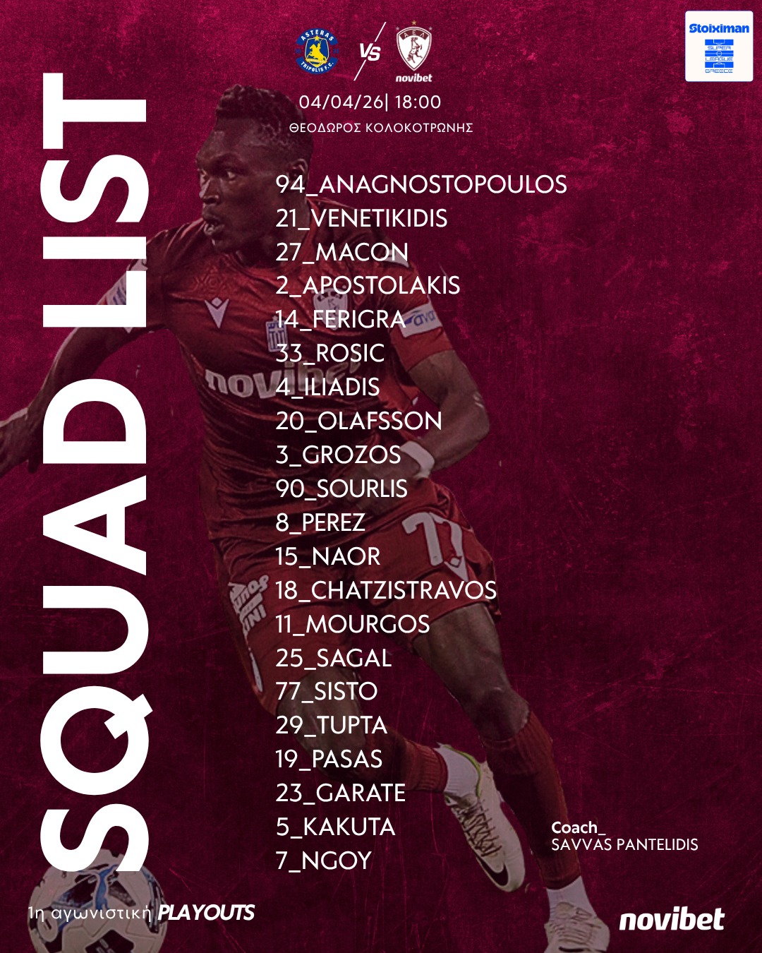 Mε στόχο το θετικό αποτέλεσμα η ΑΕΛ Νovibet ρίχνεται το Σάββατο στη μάχη των play outs στην Τρίπολη με αντίπαλο τον Αστέρα Aktor, επιδιώκοντας να κάνει το πρώτο βήμα για την παραμονή στη Super League.