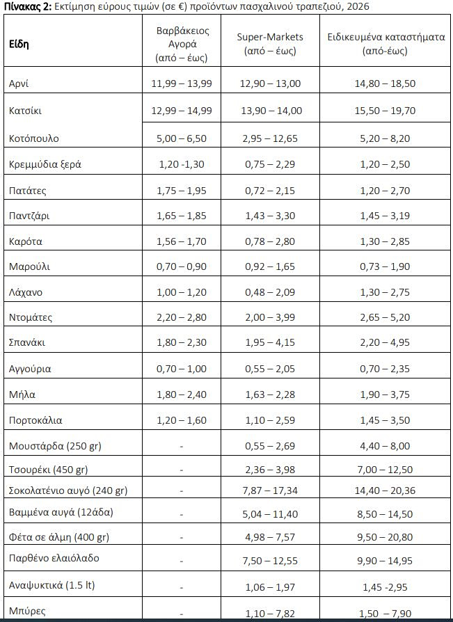 Το εύρος των τιμών προκύπτει από την καταγραφή σειράς προϊόντων διαφορετικής ποιότητας, σε αρκετές τοπικές αγορές και διαφορετικούς τύπους καταστημάτων, επισημαίνεται.