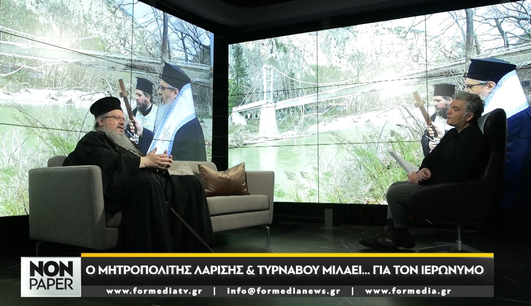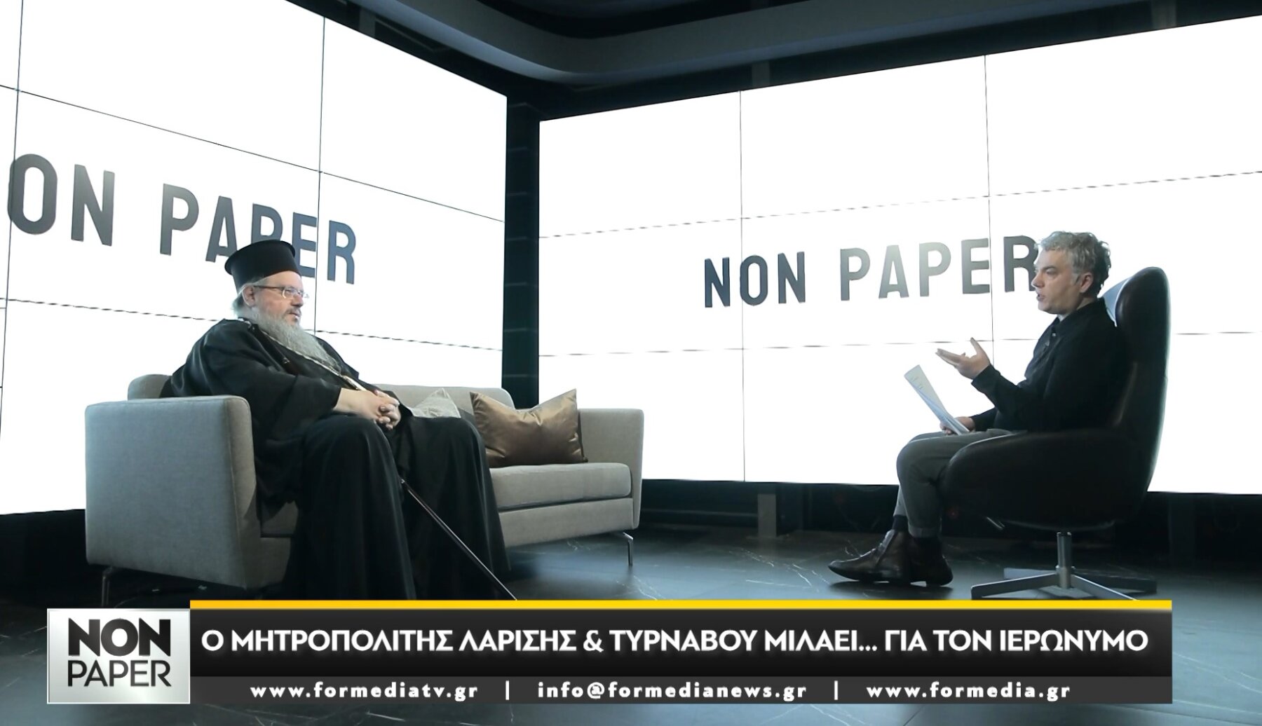 Στο κεντρικό στούντιο της Formedia TV και στον καναπέ του «Non Paper» βρέθηκε για μια διαφορετική συνέντευξη ο Μητροπολίτης Λαρίσης και Τυρνάβου κ. Ιερώνυμος. Προσκεκλημένος του Τάσου Κουρκούμπα, ο Σεβασμιώτατος άνοιξε τo προσωπικό κεφάλαιο της ζωής του, από τις σπουδές στη Νομική για το χατίρι του πατέρα δικηγόρου, μέχρι τη μεγάλη απόφαση της ιερωσύνης και τη χειροτόνησή του από τον πνευματικό του πατέρα, τον Σεβασμιώτατο Μητροπολίτη Φθιώτιδος κ. Νικόλαο.
