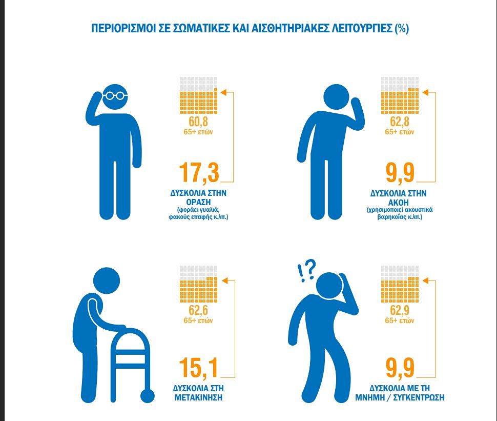 - Το 15,1% αντιμετωπίζει δυσκολία κατά τη μετακίνησή του (κάποια δυσκολία, μεγάλη δυσκολία, δεν μπορεί να περπατήσει ή να ανέβει/κατέβει σκάλα χωρίς τη χρήση οποιουδήποτε βοηθήματος ή βοήθειας από άλλον). Ποσοστό 62,6% αυτών είναι ηλικίας 65 ετών και άνω.