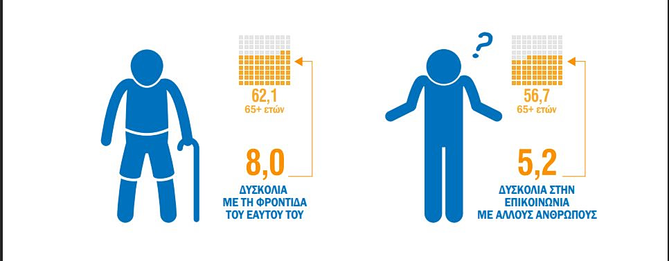 - Το 8% του πληθυσμού αντιμετωπίζει δυσκολία με τη φροντίδα (κάποια δυσκολία, μεγάλη δυσκολία, δεν μπορεί να φροντίσει τον εαυτό του, όπως να πλένεται, να ντύνεται κ.λπ.). Ποσοστό 62,1% αυτών είναι ηλικίας 65 ετών και άνω.