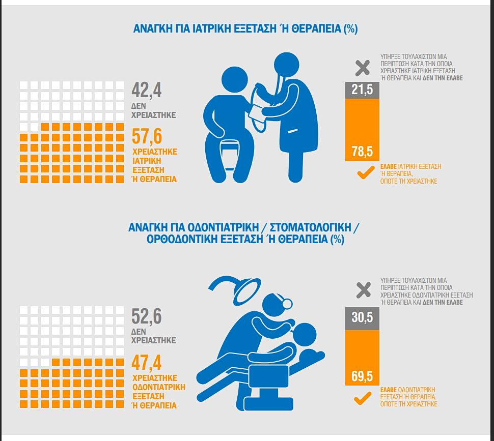 Από αυτούς, η πλειονότητα δεν μπόρεσε να λάβει αναγκαίες ιατρικές υπηρεσίες κυρίως για οικονομικούς λόγους (70,9%). Υψηλό είναι το ποσοστό όσων δεν κατάφεραν να κάνουν εξετάσεις ή να λάβουν θεραπεία κυρίως εξαιτίας της πολύ μεγάλης λίστας αναμονής (15,9%).