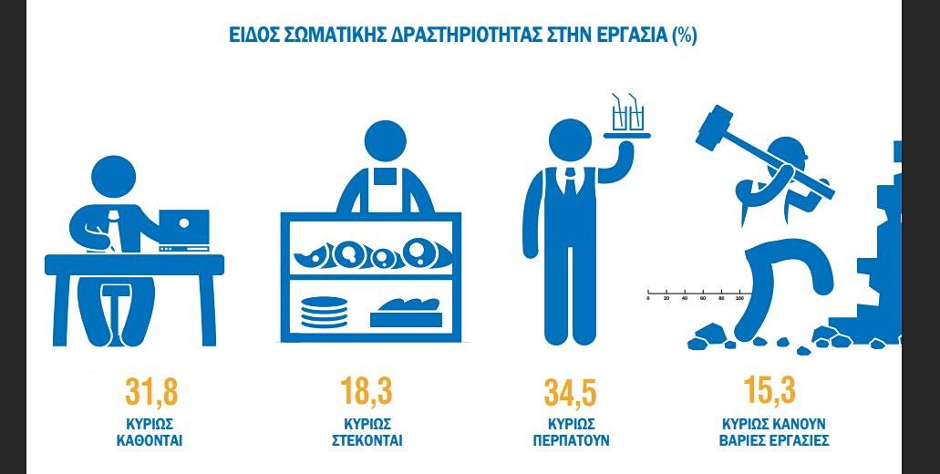 Μολονότι υπάρχει η αίσθηση ότι η πλειονότητα του πληθυσμού κάνει καθιστική εργασία, στην πραγματικότητα οι δουλειές γραφείου, που κυρίως κάθεσαι, αφορούν περίπου τους τρεις στους δέκα εργαζόμενους (31,8%). Οι περισσότεροι κάνουν εργασίες που περιλαμβάνουν κυρίως περπάτημα και μέτρια σωματική προσπάθεια (34,5%) και ορθοστασία (18,3%). Ένα 15,3% του εργαζόμενου πληθυσμού κάνει βαριές σωματικές εργασίας.