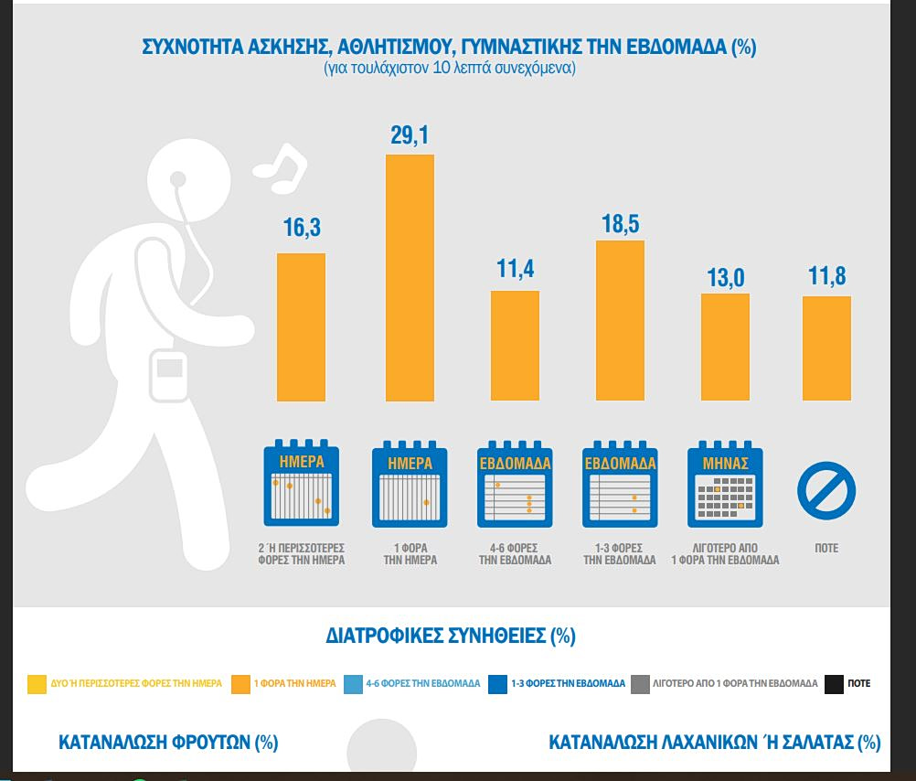 Λιγότεροι από τους μισούς είναι οι Έλληνες που περπατάνε ή αθλούνται καθημερινά. Το 29,1% μετά βίας συμπληρώνει δέκα λεπτά συνεχόμενης βάδισης ή άσκησης την ημέρα. Το 16,3% συμπληρώνει τουλάχιστον δύο δεκάλεπτα.