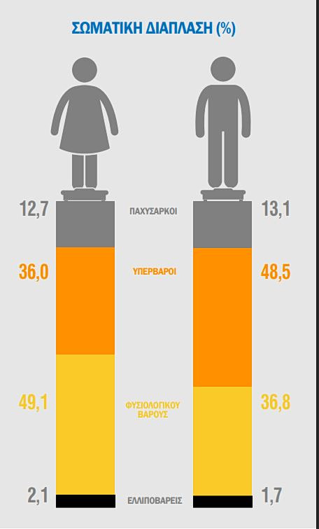 Ο ένας τους δύο άνδρες (48,5%) είναι υπέρβαρος, ενώ η αναλογία υπέρβαρων γυναικών είναι περισσότερες από τρεις στις δέκα (36%).