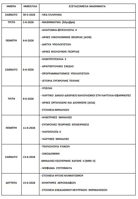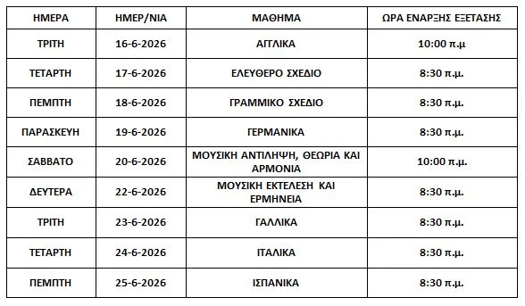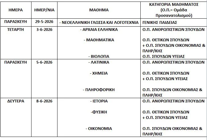 Στα λύκεια, τα μαθήματα ολοκληρώνονται την Παρασκευή 15 Μαΐου 2026, ενώ το πρόγραμμα των εξετάσεων ανακοινώνεται στους μαθητές τουλάχιστον πέντε ημέρες πριν.