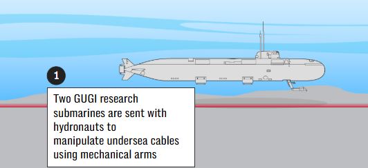 Όπως λοιπόν φαίνεται στην πρώτη φωτογραφία, δύο ερευνητικά υποβρύχια της ομάδας GUGI αποστέλλονται με το πλήρωμά τους για να πλησιάσουν τα υποθαλάσσια καλώδια χρησιμοποιώντας τους μηχανικούς βραχίονες που διαθέτουν τα υποβρύχια.