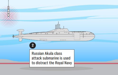 Στην δεύτερη φωτογραφία απεικονίζεται το ρωσικό υποβρύχιο κλάσης Akula. Χρησιμοποιείται για να αποσπάσει την προσοχή του Βασιλικού Ναυτικού και κρατά θέση ανάμεσα στα δύο υποβρύχια της GUCI.