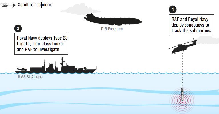 Στην επιφάνεια της θάλασσας τώρα και όπως φαίνεται και στην τρίτη φωτογραφία, το Βασιλικό Ναυτικό αναπτύσσει φρεγάτα Type 23 για να ερευνήσει την παρουσία του ρωσικού υποβρυχίου. Η Βασιλική πολεμική αεροπορία και το Βασιλικό Ναυτικό αναπτύσσουν πομπούς για να παρακολουθούν τα υποβρύχια.