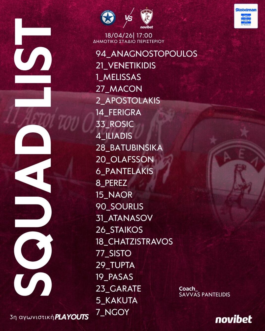 Ο τεχνικός των “βυσσινί” δεν υπολογίζει τους τραυματίες Κοσονού και Μούργο, καθώς και τον τιμωρημένο Σαγάλ. Αντίθετα επέστρεψε ο Ατανάσοφ που αποθεραπεύτηκε και έλειψε από τα δύο πρώτα ματς. Στην αποστολή βρίσκονται 23 ποδοσφαιριστές που είναι οι εξής: