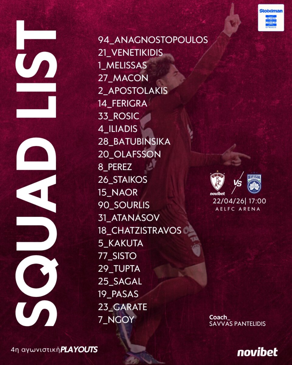 Οι 23 παίκτες που επέλεξε για τον αγώνα με την Κηφισιά ο Σάββας Παντελίδης είναι οι Aναγνωστόπουλος, Βενετικίδης, Μελίσσας, Μασόν, Αποστολάκης, Ρόσιτς,Μπατουμπινσικά, Φερίγκρα, Ηλιάδης, Όλαφσον, Σουρλής, Ναόρ, Πέρεζ, Ατανάσοφ, Στάικος, Χατζηστραβός, Τούπτα,Σαγάλ, Πασάς, Γκαράτε, Κακουτά, Σίστο, Ενγκόι