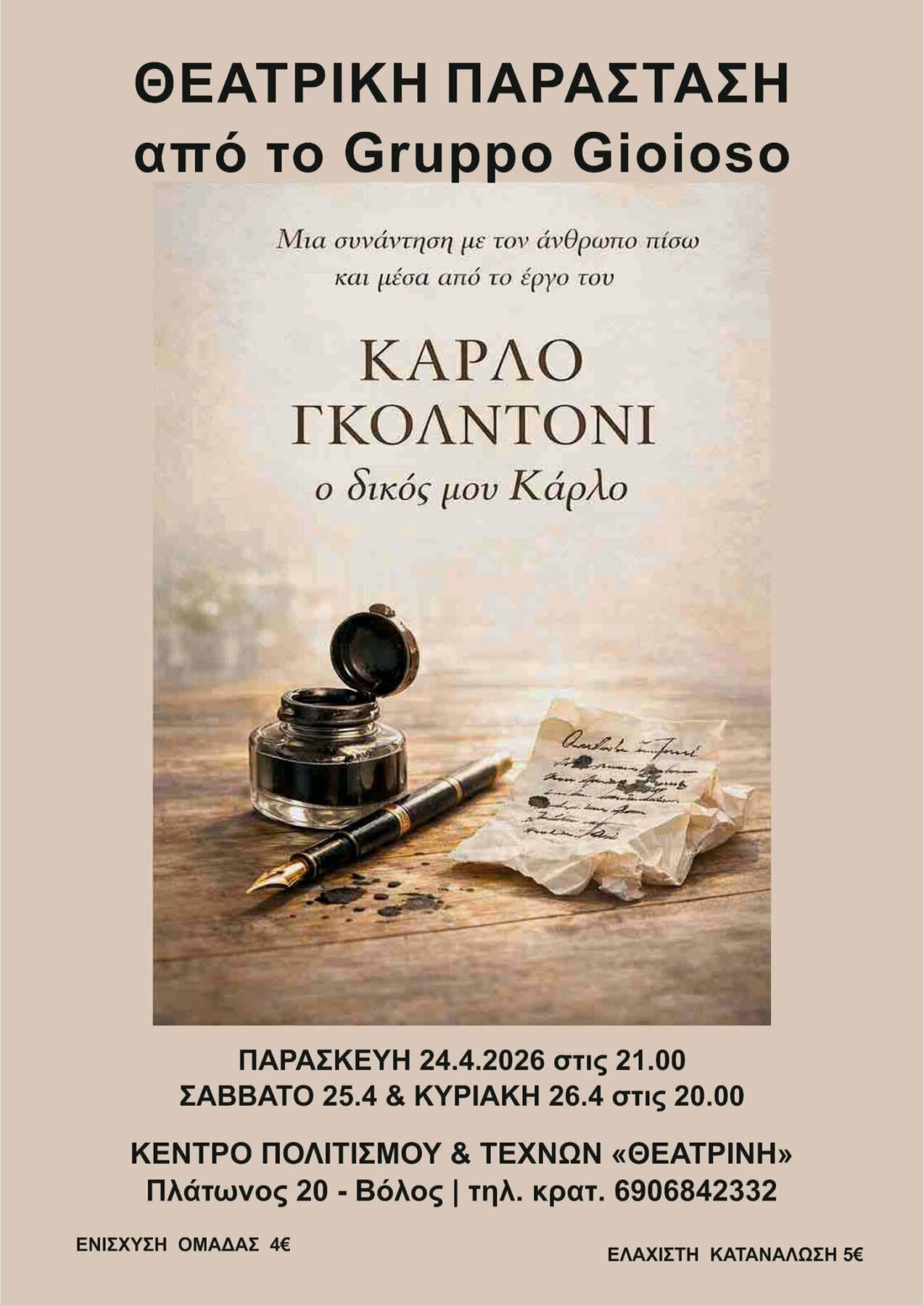 Ένα ξεχωριστό θεατρικό ταξίδι στον κόσμο του Κάρλο Γκολντόνι έχει ετοιμάσει η Ερασιτεχνική Θεατρική Ομάδα GRUPPO GIOIOSO, που παρουσιάζει στο Βόλο την παράσταση «Κάρλο Γκολντόνι, ο δικός μου Κάρλο», από την Παρασκευή 24 Απριλίου έως και την Κυριακή 26 Απριλίου, στο Κέντρο Πολιτισμού και Τεχνών «Θεατρίνη».