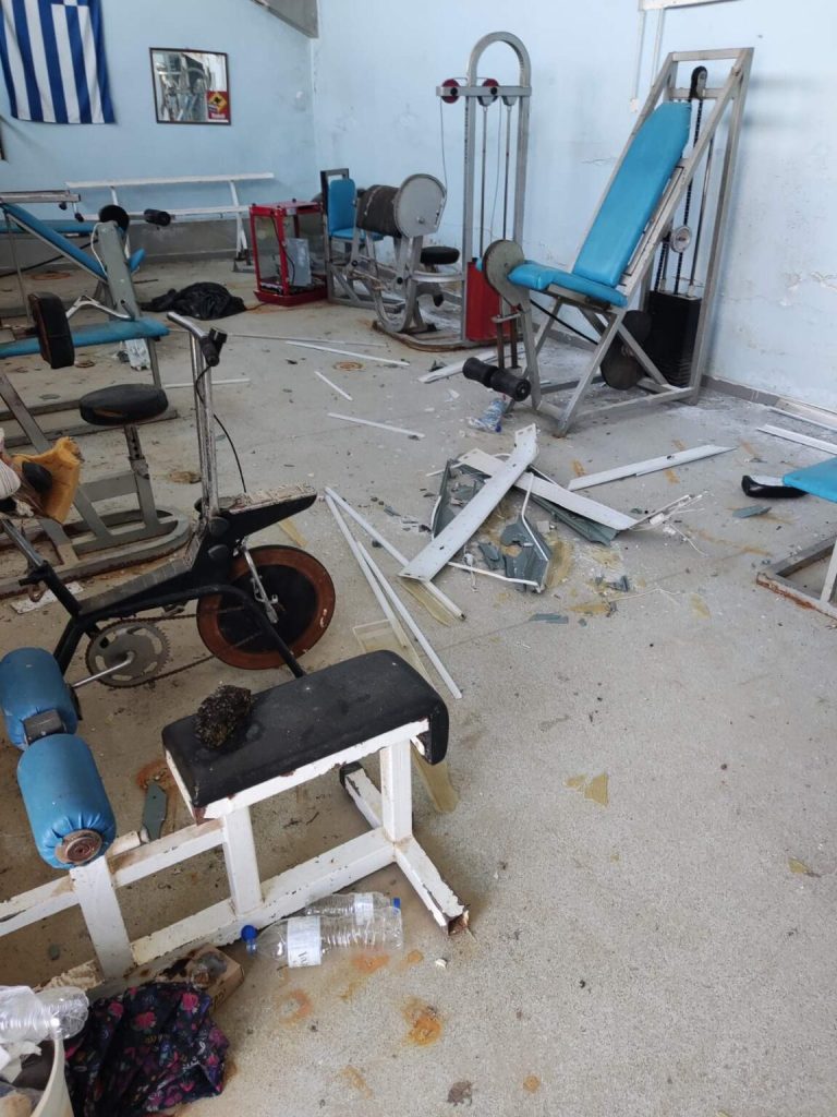 Την ίδια ώρα, φωτογραφικό υλικό από το εσωτερικό των εγκαταστάσεων καταγράφει εικόνες εκτεταμένης φθοράς και υποβάθμισης. Στις εικόνες διακρίνονται σπασμένα φωτιστικά, φθαρμένος ηλεκτρολογικός εξοπλισμός, κατεστραμμένα όργανα γυμναστικής, διάσπαρτα υλικά και σκουπίδια, καθώς και προβλήματα σε βοηθητικούς χώρους.