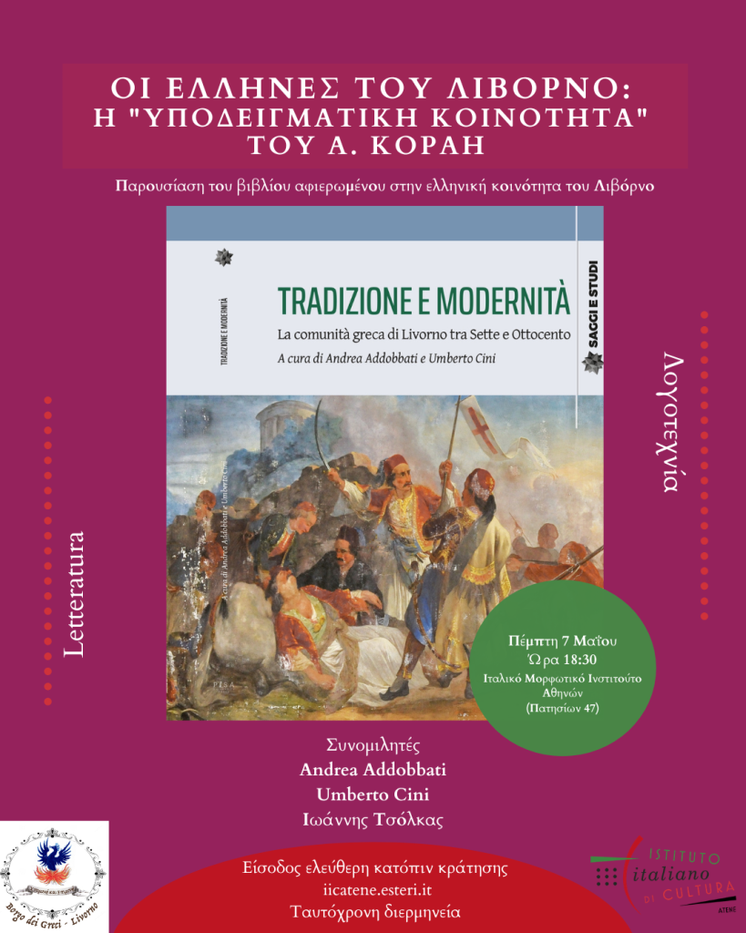 Το Ιταλικό Μορφωτικό Ινστιτούτο Αθηνών, σε συνεργασία με τον πολιτιστικό σύλλογο «Borgo dei Greci» του Λιβόρνο, διοργανώνει εκδήλωση για την παρουσίαση του βιβλίου: ΟΙ ΕΛΛΗΝΕΣ ΤΟΥ ΛΙΒΟΡΝΟ: Η «ΥΠΟΔΕΙΓΜΑΤΙΚΗ ΚΟΙΝΟΤΗΤΑ» ΤΟΥ Α. ΚΟΡΑΗ, την Πέμπτη 7 Μαΐου – ώρα 18:30, στο Ιταλικό Μορφωτικό Ινστιτούτο (Πατησίων 47).