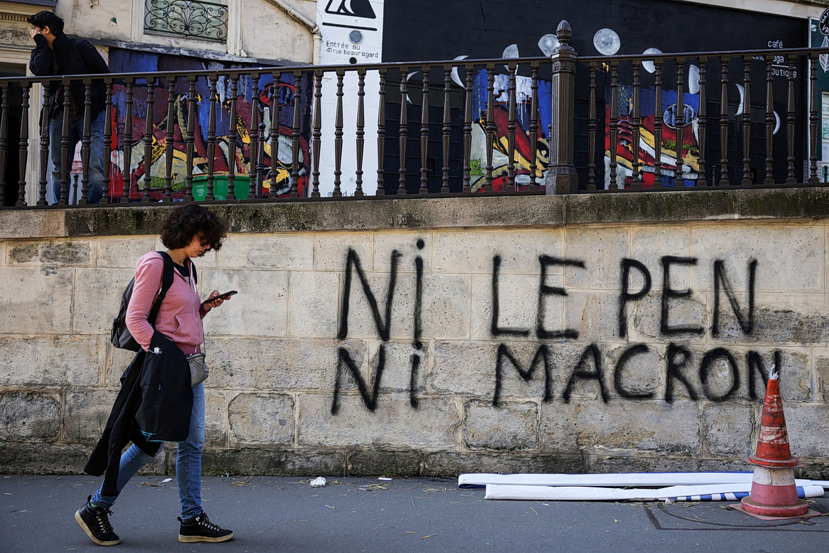 «Ούτε Λεπέν ούτε Μακρόν» γράφει το σύνθημα σε τοίχο στο Σεν Ντενί, κατά τις προηγούμενες προεδρικές εκλογές στη Γαλλία, το 2022 (REUTERS/Sarah Meyssonnier)